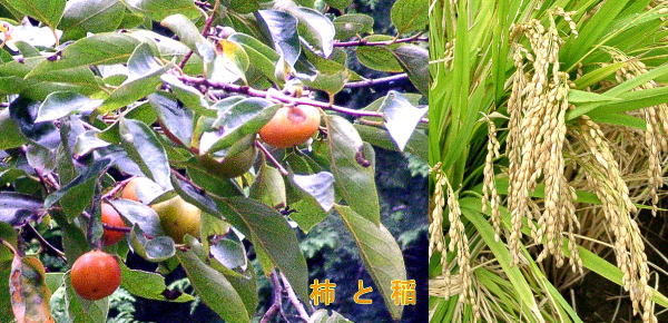 先進的に色づいた柿を選びました。そして稲は刈り入れ間近です。田植えをした学校が特別