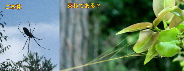 糸をたどっていくと近くの木に絡んだサルトリイバラにたくさんの糸でつながっています。