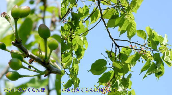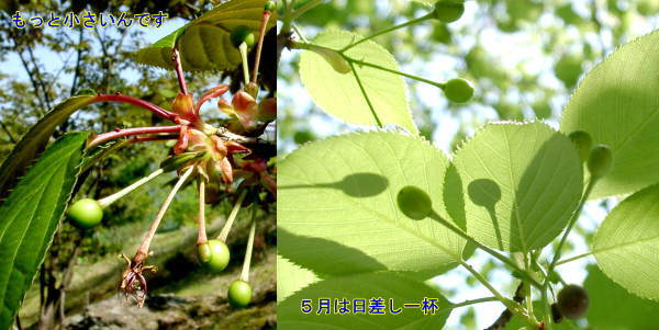左はまださくらんぼになりかけ、散った花の残骸と較べてください。右、葉に影を落としている実