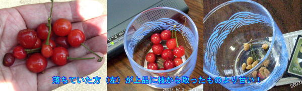 左はホントのさくらんぼ、さすがに他の種類より2まわりくらい大きく、かす