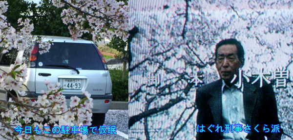 帰り、道路は他の仮眠用駐車場の桜も満開です。そして、なぜか夜の「はぐれ刑事」も桜でした。