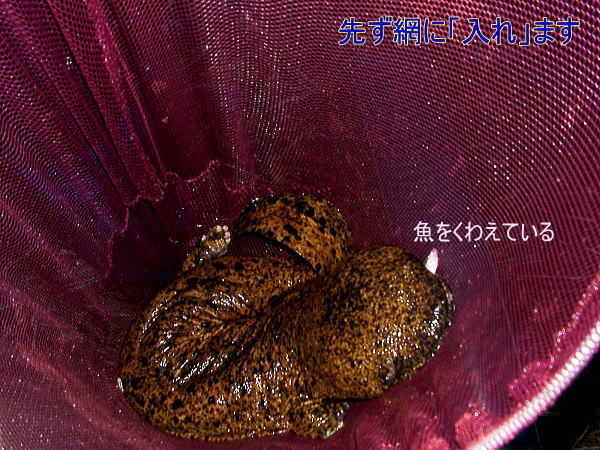 して大きな網に入れます。網ですくう、というよりは入ってもらう感じです。