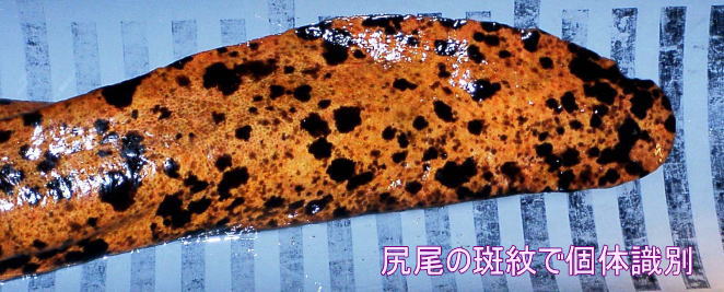 全身まだら紋様のうち、尻尾左面の紋を記録して個体識別に使います。