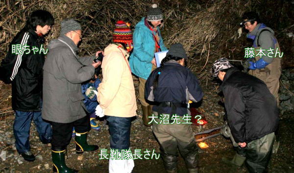 調査隊は胸まで長靴でジャブジャブと入っていき、おじさんたち4人に、