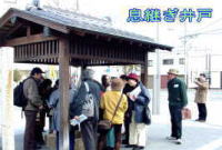 12時15分、JR赤穂線播州赤穂駅集合、駅前でチョッといろ いろしてから早速行進開始、最初が「息継ぎの井戸」です。 「殿ご切腹」の第1報を早籠でもたらした使者が息を継いだ 井戸、言わずと知れたあの井戸です。しかし、そこで知らさ れるのは三角州上の砂地都市赤穂の大規模な水道シス テムの話です。 |