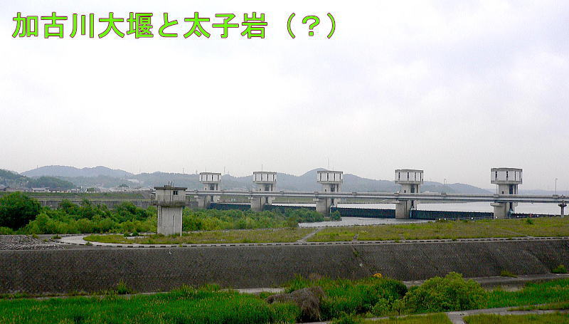 加古川の駅から見学することになっているニッケの工場に電話をかけましたが、担当の課長さんが忙しくてダメ、すぐに出発する厄神行きに乗ります。本島はツァーの順序どおり中流の三ヶ村井堰から始めて加古川沿いに下がってこようと考えたのですが、加古川沿いに走る加古川線の接続のご都合でちょうど逆順になってしまいました。というわけで厄神で下りたら、ちょうど運良くタクシーがいて、先ず加古川大堰、そのすぐそばが太子岩(写真に写っている岩は違うらしい、とは運転手さん)、に行きました。 |