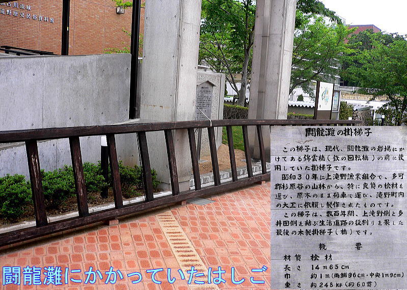 次は滝野の加古川流域歴史民俗資料館です。ご記憶かもしれませんがこのツァーは去年9月に予定していたのですが、 6月に下見に来てこの資料館がリニューアルのため休館に入るということで急遽「人と自然の博物館」にしたのです。今日は資料館のリニューアル振りを検分、係りの方といろいろ打ち合わせをして、駅にとんぼ返り、次の電車に滑り込みました。 闘龍灘は去年の下見の写真からおわかりのように、加古川をせき止めるかたい岩の割れ目を流れが削ってできた急流部分です。水運にとっては「随一の難所」、同じように陸路をふさぐのです。この15m近い木のはしごを渡して、人々が行き来するようになったのは1955年のこと、それまでは上流か下流の渡しに頼っていたのでしょう。数年前に行ったときは鉄の橋がついていて、観光客が渡れるようになっていましたが、台風の増水か何かで壊れていました。 |