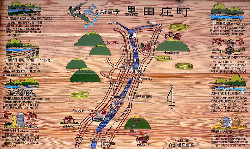 加古川本流(佐治川)と篠山川の合流点です。ここに中世のいかだ場、舟町、取水堰などが集中していて、ツァーでは集合場所から先ずここに直行します。案内板にはツァーで計画している以外のものも出ていて、とてもわかりやすく、助かりました。 |