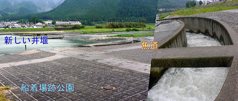 川沿いに堰があって川に面して公園があります、船着場公園、そして堰が三ヶ村井堰を五ヶ村に拡大して1992年に完成した西方井堰の水です。横を魚道が通っていますが、鮎の姿は見えません。ツァーの頃は結構季節じゃないかなぁ? この堰は永徳3年(1383念、南北朝時代、永徳は北朝の元号)に「常堰」として認められた記録があったり、古くから使われていましたが、文久3年(1673年、江戸時代初期)大規模な井堰を作り、加古川水運の紛争を起こしたりしました。 |