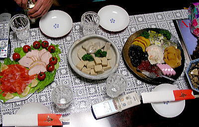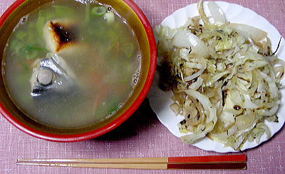 姫路は久しぶりの食事です。曲がりなりにもお餅がありました。もう一つ縁起のいい鮭の頭。何とか雑煮になりました。野菜は(雑煮のみも含めて)冷蔵庫で生き抜いた子たちです。 |