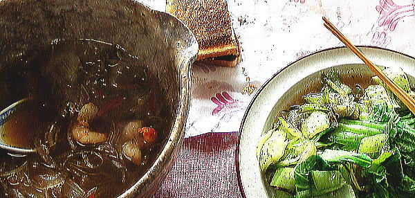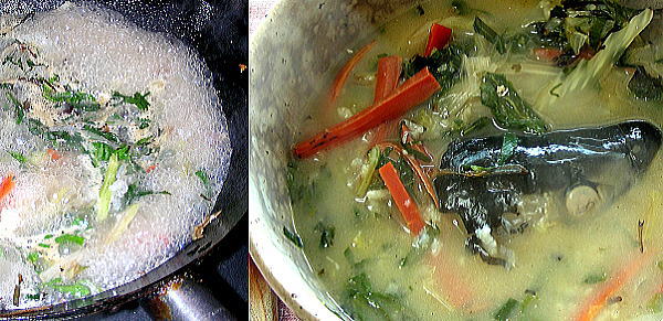 1月6日朝 久しぶりのおかゆです。おじさんのおかゆはご飯がチョット、長くぁ〜〜く炊いて、野菜の具をたくさん入れます。たいていは野菜をフライパンで炒め、炊けて来たお粥を入れます(左)大きなフライパン一杯に沸き立ち、おかゆの匂いが立ち込めます。今日はわかめと味噌も入れました。 |