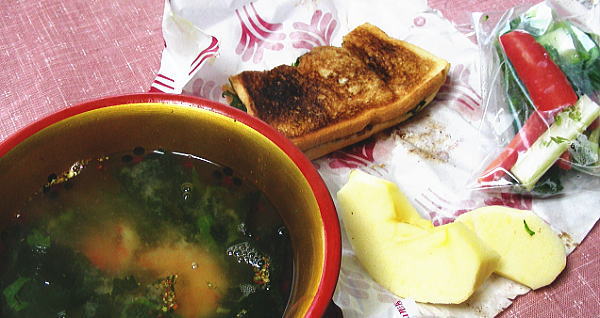 8日朝 自然学校はたいていは月火曜日出勤することにしています。昨夕には気分もかなりよくなって、明日は行こうか、になりかけていたので、お弁当を作ってしまいました。サンドィッチ(左)とスープの具(右)です。 |
