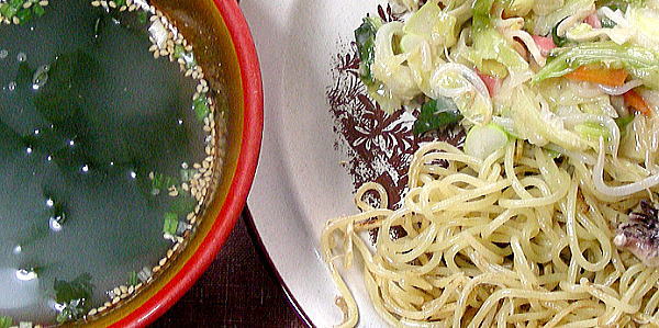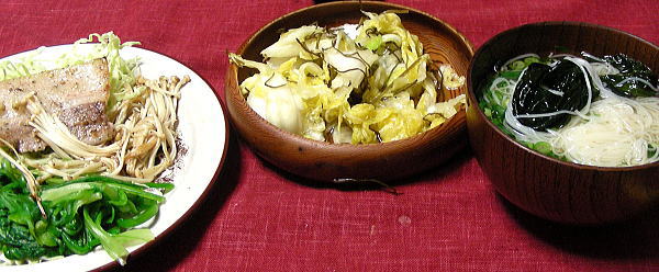 7日夜 お歳暮で頂いた冷凍長崎ちゃんぽん、結構楽だしおいしいし、でも、おじさんこの頃の食べ量から言うと、麺は3回分、野菜は一回より少し少ない感じなんです。その上今回は冷凍分を切り分けようとして、包丁の刃がこぼれてしまいました。かけらが見つからないので麺は悲しいことに。焼そば風にしました。 |