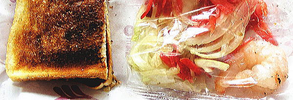 1月7日朝 自然学校は「出勤」予定だったので、お弁当が作ってありました。トーストサンド(中は??硬くってすきなんです。スープ(今日は袋入りわかめスープ、オニオンスライス、えのきだけ、春雨、むき海老などの足し前つき)、人参大根など野菜スティック、それにりんごです。お医者に行ったりするので、そのまま食べちゃいま舌。 |
