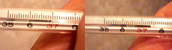 それから1週間 古い水銀体温計を5分脇の下で測っていました。ところが、です5分が待ちきれなくてウトウト(その間に変な寝返りでもして、ガラスが折れて血管に水銀が流れ込んじゃってたら、アアオソロシイ)してしまったのです。古い体温計、5分ではたりなかったのかなぁ? |