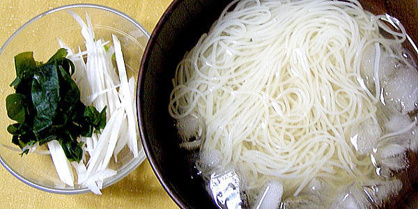 そうめんの薬味にはわかめと大根(皮だけピーラーで剥いて千切り、けっこう辛い)です。 |
