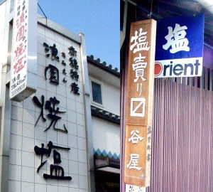 赤穂は忠臣蔵の町であるとともに塩 の町、昔から塩田で栄えてきました。 何しろ船一艘分の塩が赤穂で4千両、 江戸に持っていけば1万両なんです。 浅野家が金持ちだった、赤穂に大規 模な水道システムが発達したのもそ んな背景があった、というわけです。 というわけで、町のあちこちで塩屋さ んの看板を見かけます。お土産にも 塩は重要です。何しろ、塩を固めて 作ったぐい飲みまであるのです。 (のみはじめは少し薬品的な匂い がしたり、あまり満足感がありません) |