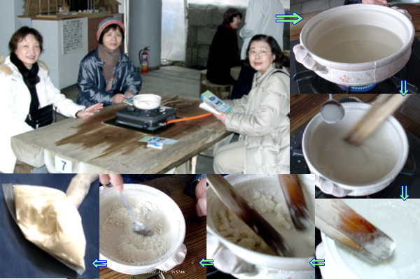 煮詰めます。へらのようなものでかき混ぜているとだんだんどろどろして、そのうちパチ