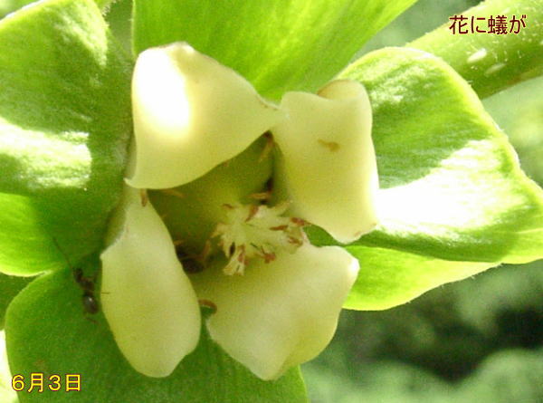 がちぎったのかも。でもお陰で花粉が運ばれて柿さん喜んでいます。蟻さんもちょうどやっ
