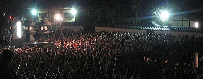 始まりは7時、4時前から一番前の方(火の粉が少しかかるくらい)に場所を取り、隣の人と交替でトイレに行ったり、ひたすら待ちます。あたりが暗くなるともうこんな人出です。 | ||||||||||