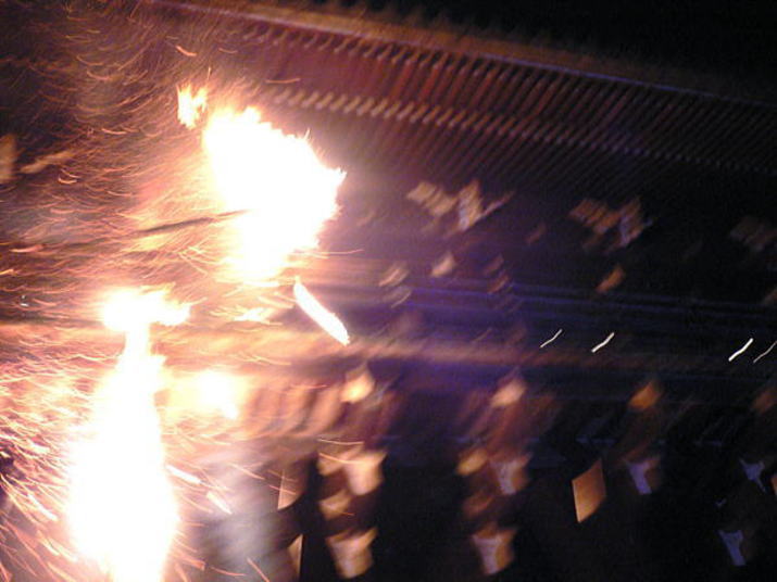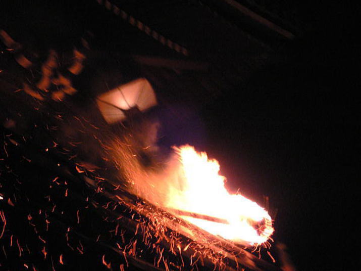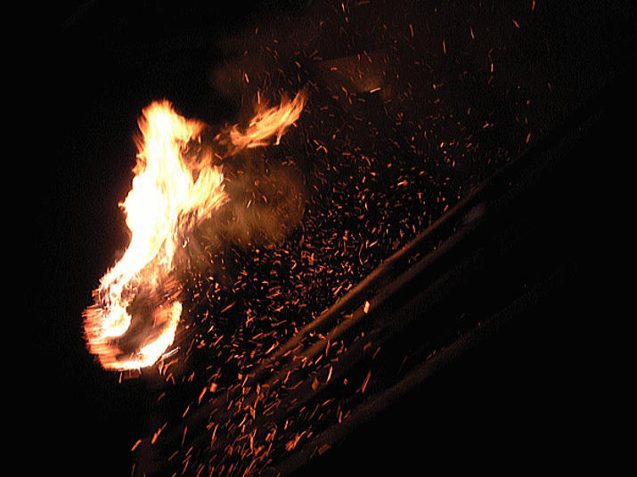 大きく燃え上がると、欄干を勢いよく走り抜けます。凄い火の粉です。 | ||||||||||