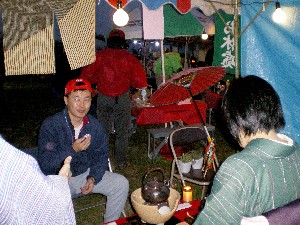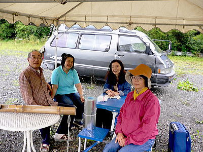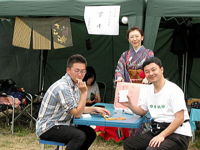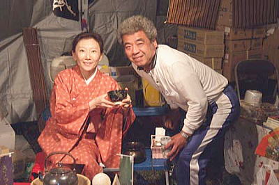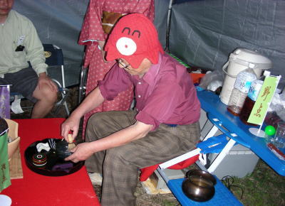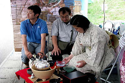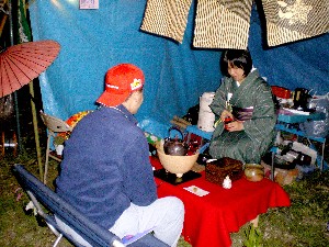 野点席が出来上がってすぐにリハーサルです。まずはモリモトおじさんから。なかなかお稽古に出席できないおじさんですが、ヒマを見つけては、密かに姫路自宅で自習 稽古をしているんです。日頃の鍛錬の成果を披露〜なかなかイイ茶筅の振りです。 |