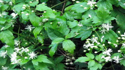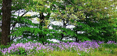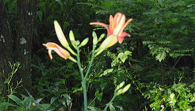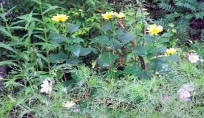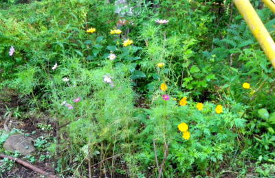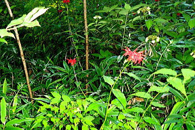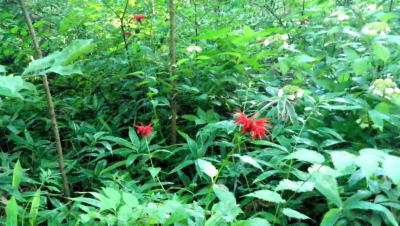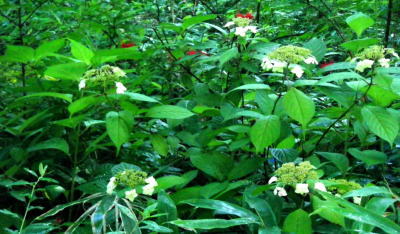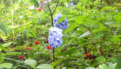 これはどこかのお庭ですが少し地味 大きな森の中、大きな別荘やペンションが並びますが、今朝は小川に沿ったり、林を抜けたり、大きく見事な園芸種の花々より、小さな花がそれぞれに咲くコースだったようで、それなりのいい朝でした。 |