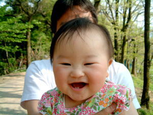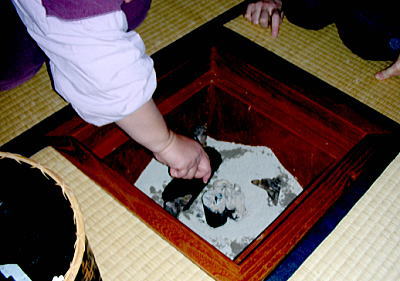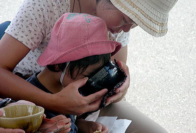 初めてのお抹茶体験は2歳と数ヶ月のお嬢ちゃま。少し不安げ?そこはやっぱり甘いモノで・・・毎度お馴染み明石の「子午せん」。 |