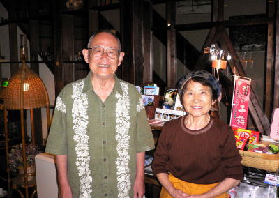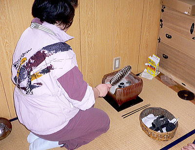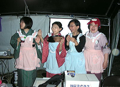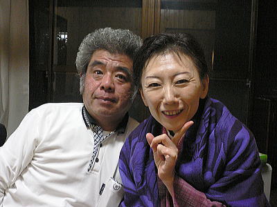 あら、お店を放ったらかしてアルジはこんなところで一服。みーちゃん&はーち ゃん(ファーストネームの頭の一字で呼ぶとこうなるんです、ほんと)コンビによるお もてなし〜。にわか稽古でよく働いてくれました |