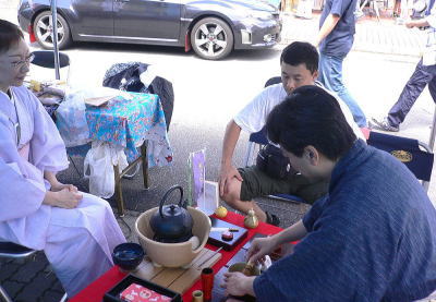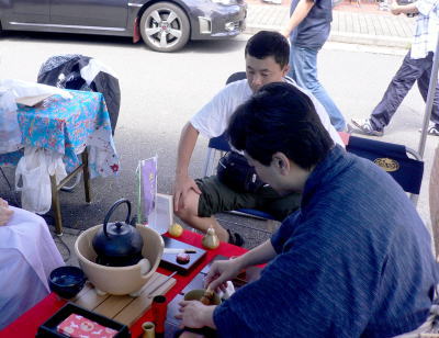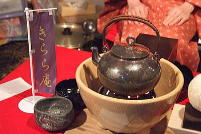 今回は、絞りに絞って必要最小限のお茶グッズのみ持ち込みましたので、ブースは「モリモト商店」に居候させていただきました。そうです、いつもと反対の立場。「きらら庵」の看板は出したものの、見えるのはモリモト商品だけ。「え?どこでお茶するの?」という「まるで京都のお店みたい」な状況の中でも、こうしてお客様が一服して下さいました。 |