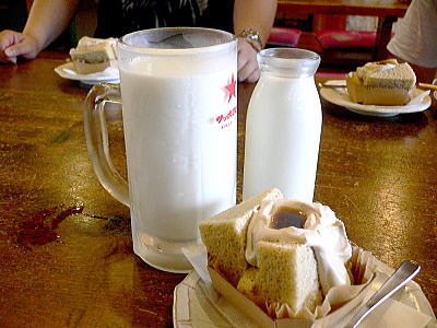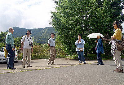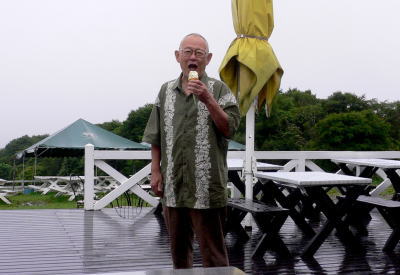 まずは集合前の腹ごなし。風味豊かな手打ち蕎麦を堪能した「あとの祭り」はもちろんデザート。そばシフォンケーキにドリンクセット。そのドリンク選択肢は、コーヒー、ジュース、牛乳。高原らしく牛乳をチョイスした森本おじさんに店員さんの言うことにゃ、「ビンですか?ジョッキですか?」。おじさんの宇宙でジョッキと言えばビールに決まっているわけですが・・・これにはさすがのおじさんも目がまん丸でした。もちろん「ジョッキで」と相成りました。 |