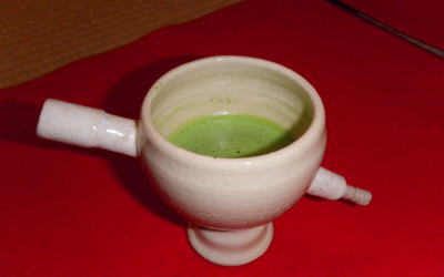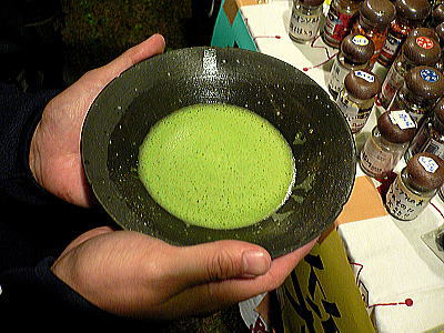 こちらは知る人ぞ知る三春の遊彷陶房、日下部先生の「望遠鏡付き抜けワイングラス(?)」。ちょっとムリして抹茶茶碗に転用。何とかマトモにお茶が点ちました。祭りにはこれくらいチャレンジしないと!ね。 |