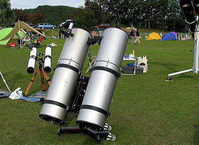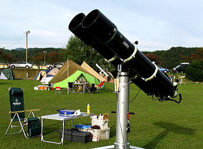 2つの望遠鏡の位置関係を工夫して、双眼視の光学系を単純化した。この星まつりに出る天体望遠鏡はいろいろな工夫によってアッと驚くような特徴を出す、といった行きかたを競う感じがあり、特にそれが双眼鏡に強く現れている感じがあり楽しみなんです。 |