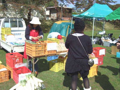 石川町の坂本さんの産直はりんごなしの果実から、ほうれん草キャベツ、しまいにはお米まで、大人気でした。 |