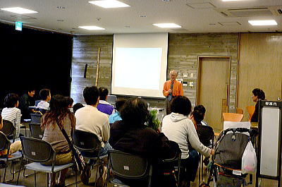 これもお馴染みになってきた、森本おじさんの天文話。今回はまるで教授のよう な講演。皆さん熱心に・・・。 |