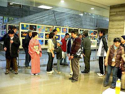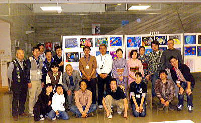 「後の祭り」集合写真前のショット。後ろにずらり貼られた絵は、宇宙を描いた 小学生の作品。ほう、なるほど〜というものや、えーーー???というものや、絶句・ ・や・・・見ていて飽きない展示でした。来年はyumiさんも応募してみようかな。 |