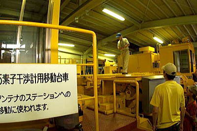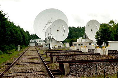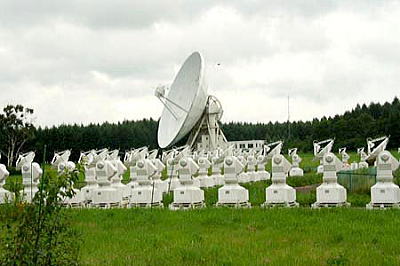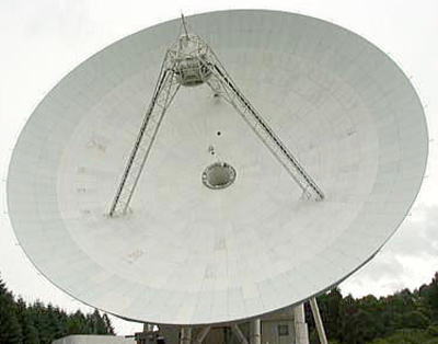 太陽観測用85センチパラボラアンテナたち、「スターウォーズ」に出てくるダースベーダーの手下のロボット軍団を再利用したらしい。 |