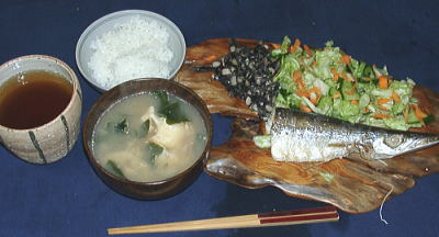開きの上半身、浅漬け、納豆、タップリの味噌汁です。