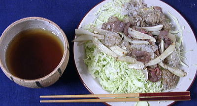 軽く。キャベツを刻み、残った茎の部分はまた刻んで豚肉