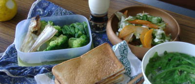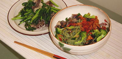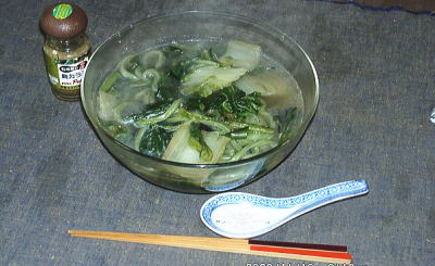 春菊、ブロッコリ(昨日のお弁当の残り)にねぎ、キムチ、わ