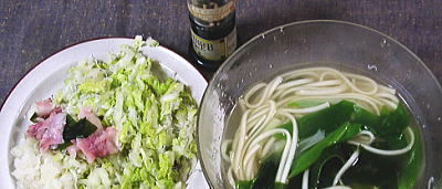 白菜、わかめ、ねぎ、牛馬らに区でうどんです。