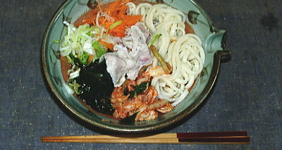 12月1日(日) さぁ、オーストラリアに出発 出掛けの駄賃、小腹の足しに、冷うどん。刻み人参(茹で) ねぎ、わかめ、キムチ、豚しゃぶつるつると掻きこみました。 |