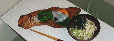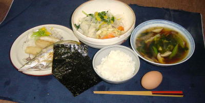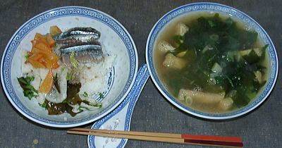 11月21日(木) さんま丼にたっぷり味噌汁 昨夜のさんまの刺身、チョッと3切れほど残しておき朝ご飯 です。薄く切った柿で甘味、蕪と昆布の酢漬けでチョッと酸 っぱ味、中々乙でした。からだ温め用には油揚げ、若芽を たっぷり入れてねぎを刻んだおみおつけ、こっちも丼にい っぱいです。 |