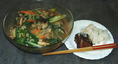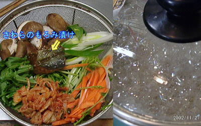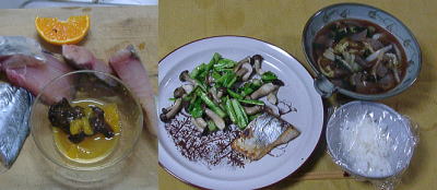 今日は寝たきり老人練習日、出かける用事何にもありませ ん。少し早く目が覚めましたが、ゆっくりおかゆの用意です。 水菜、岩常木(初物、まだチョッと硬い)椎茸、人参、キムチそ れに3日ほど前に買ったさわらの切り身をもろみ味噌に熟 柿の汁を合わせて軟らかくして漬けておいたのを焼いて、お 粥の具です。お粥本体はおだしをたっぷり取って冷凍ご飯を ことこと炊きます。 |