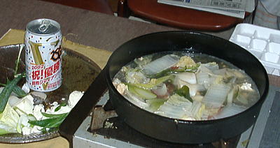 カメラのテスト、旅先でメールを見る、あわよくばHPの更新も そんなことを考えると、結構「寝たきり」していられないんで す。朝は例によってうどん。小松菜にアスパラ、椎茸に卵、 豚薄切りはキムチと塩わかめとあえて、味を付けておきま す。野菜は炒めて、だしと2/3茹でのうどんを入れ、キムチ わかめ肉と卵を最後に入れました。 |