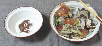 ホントは餃子にしようとえび、きのこなんかを買ってきてあっ たのですが、ひとまず腹を少し、というわけであさりを炒めま した。付け合わせにいアスパラ、ねぎ、舞茸それに揚げ餅用 の薄く切って乾いた餅を入れました。アサリの汁で膨らんで 期待通りでした。何か満足してしまい、お風呂に入って寝て しまいました。その代わり朝は豪華なおかゆになりました。 |