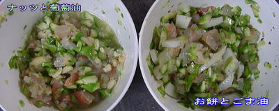 一昨日、おいしそうな剥き海老買ったのです。久し振りで 餃子を食べよう。と、太く逞しくてチョッと曲がったオースト ラリアのアスパラが目につきました。相手は決まりです。 海老のぷりぷり、アスパラのさくさく食感それにもう一つ ハワイマカダミアナッツのぽりぽり、お持ちの餅餅食感を! そんなわけで二つに分け、一方はナッツと葡萄油、もう一 方はお餅と胡麻油を加えました。 |
