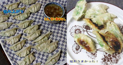 食感狙いとあれば中身はあんまり細かく刻めません。「餡」 というよりはまさに「中身」です。中身がごつごつすると皮で 包むのはチョッと手間ですが何とかしました。 |