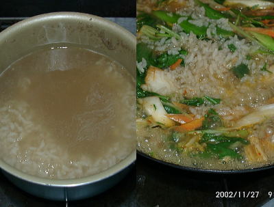 お粥がかなりトロッとしてきたらフライパンで野菜を半炒め、 そこに煮立ち加減のおかゆを注ぎます。フライパン中泡に なり、幸福なおかゆの香りが立ち込めます。 |