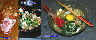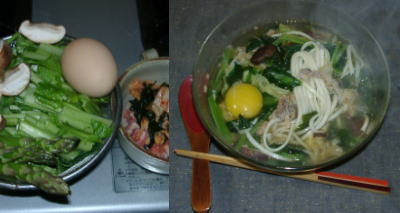 朝はうどんです。 例によって具沢山、水菜、人参、舞茸、ねぎを炒めてキムチと 肉を入れました。最後に卵を割って・・・ |